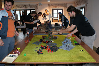 Ja, seine Liste war jetzt nichts besonders, 2 Sturmtrupps im Razor (schwere Bolter) 1 Taktischer in der Kapsel, Sturmtermis mit Priester, Baal Predator mit StuKa, Predator mit Maschinenkanone und LK Kuppeln, Land Raider, Todeskompanie und Todeskompanie Cybot.